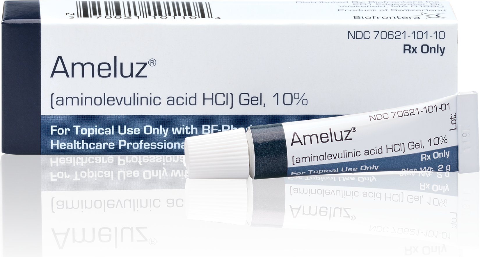 AMELUZ® (aminolevulinic acid hydrochloride) topical gel, 10%, a porphyrin precursor, in combination with photodynamic therapy using BF‑RhodoLED® lamp, is indicated for the lesion-directed and field-directed treatment of actinic keratoses of mild-to-moderate severity on the face and scalp.