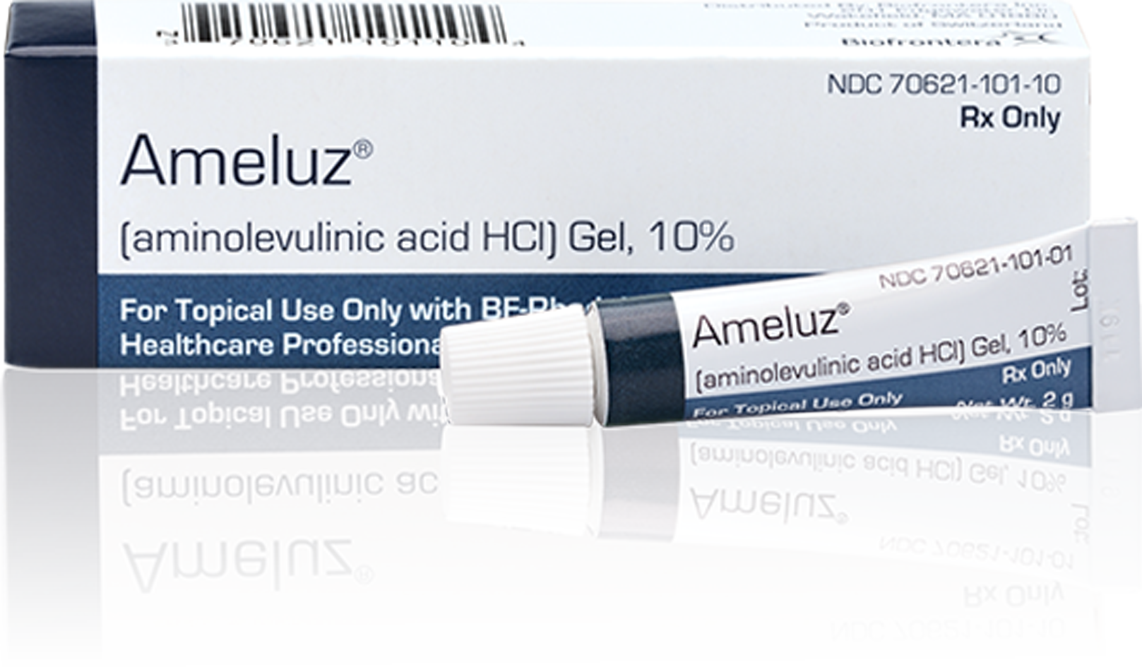 References: 1. AMELUZ [prescribing information]. Woburn, MA: Biofrontera Inc; 2021. 2. Reinhold U. A review of BF-200 ALA for the photodynamic treatment of mild-to-moderate actinic keratosis. Future Oncol. 2017;13(27):2413-2428. 3. Reinhold U, Dirschka T, Ostendorf R, et al. A randomized, double-blind, phase III, multicentre study to evaluate the safety and efficacy of BF-200 ALA (Ameluz) vs. placebo in the field-directed treatment of mild-to-moderate actinic keratosis with photodynamic therapy (PDT) when using the BF-RhodoLED lamp. Br J Dermatol. 2016;175(4):696-705. 4. Maisch T, Santarelli F, Schreml S, et al. Fluorescence induction of protoporphyrin IX by a new 5-aminolevulinic acid nanoemulsion used for photodynamic therapy in a full-thickness ex vivo skin model. Exp Dermatol. 2010;19(8):e302-305. 5. Agostinis P, Berg K, Cengel KA, et al. Photodynamic therapy of cancer: an update. CA Cancer J Clin. 2011;61(4):250-281. 6. Wu Y, Li YH, Gao XH, et al. The application of nanoemulsion in dermatology: an overview. J Drug Target. 2013;21(4):321-327. 7. Peng Q, Warloe T, Berg K, et al. 5-Aminolevulinic acid-based photodynamic therapy. Clinical research and future challenges. Cancer. 1997;79(12):2282-2308.